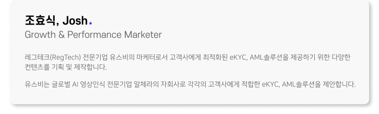 이러한 고객의 복잡한 규제문제를 해결하기 위해 레그테크(Reg-Tech) 스타트업 유스비가 출시한 것이 바로 비대면 고객확인 통합 솔루션, ‘useB. eKYC 솔루션’입니다.