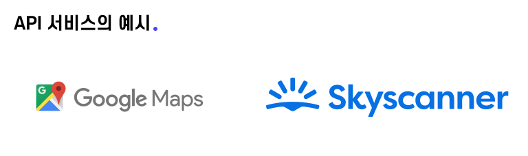 API 서비스의 대표적인 예시로는 구글맵, 스카이스캐너와 같이 보유한 웹사이트에 빠르게 기능을 구현할 수 있도록 하는 솔루션들이 있습니다.